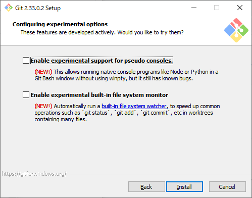 再度オプションを聞いてきますが、これらは推奨されないので選択せず「Install」をクリックします。