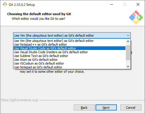 デフォルトで利用するエディタを聞いてくるので、どれか選んで「Next」をクリックします。