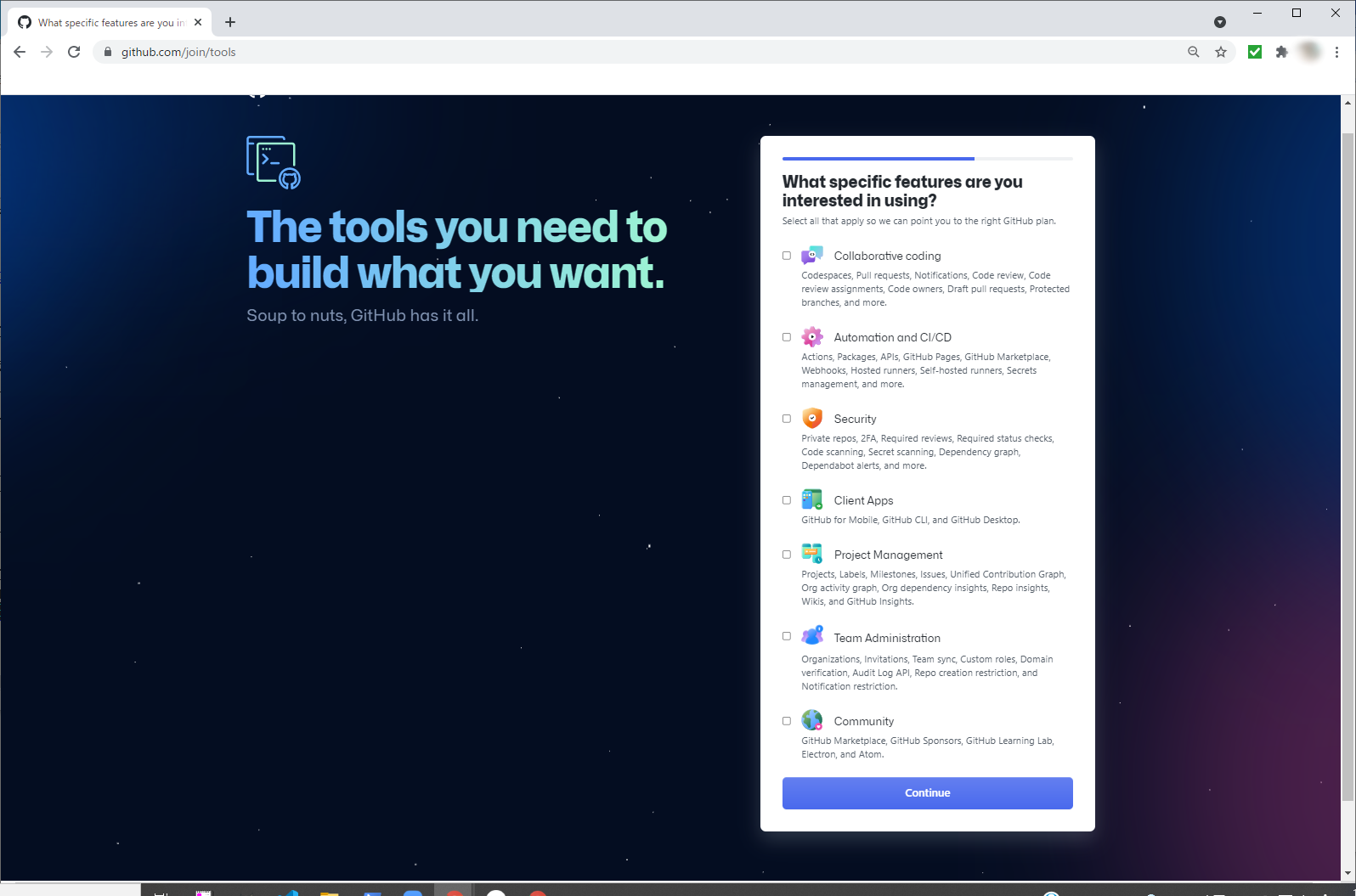 使い道を聞いてくるので、適当に選択して「Continue」をクリックします。