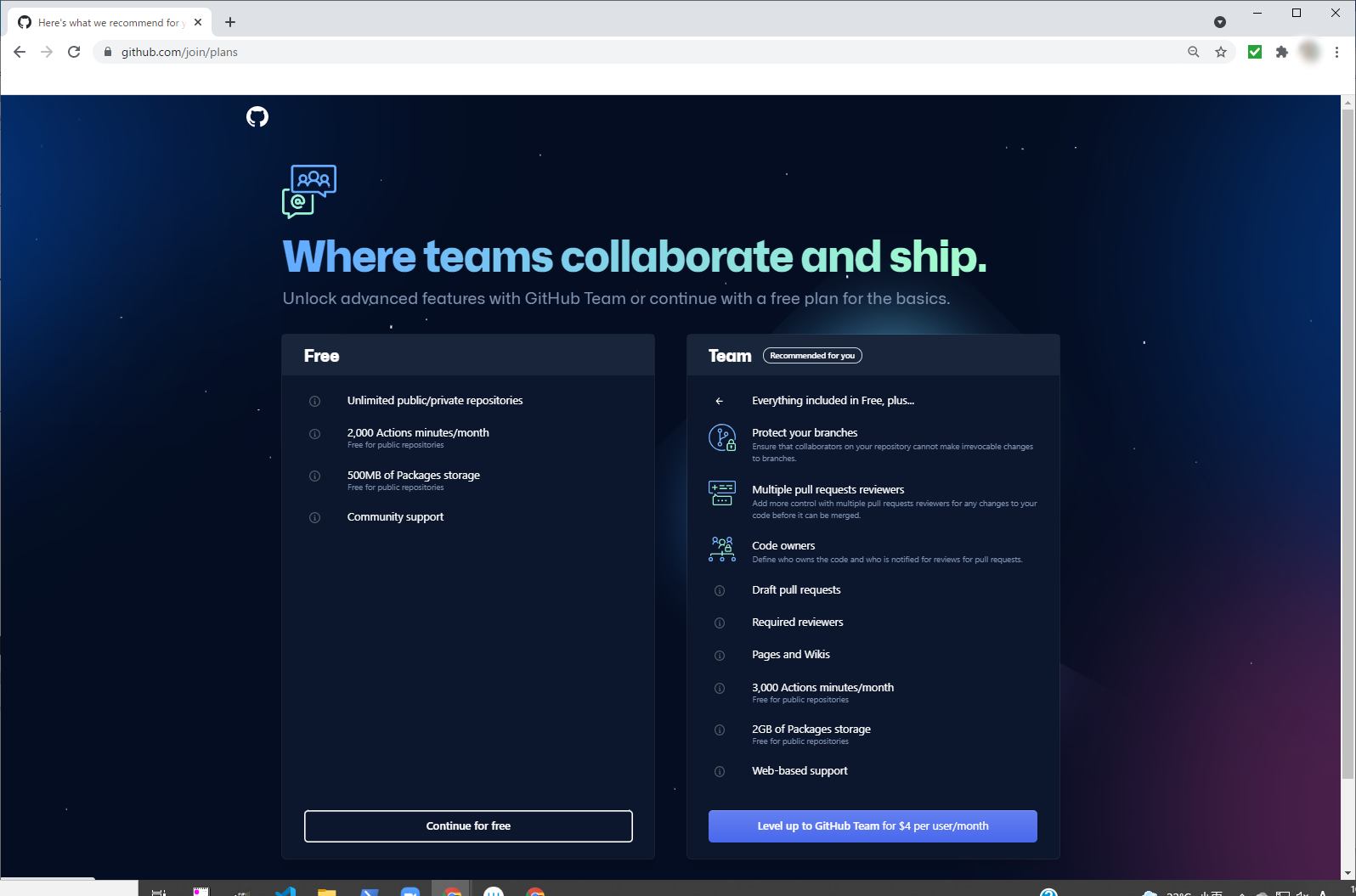 有償・無償のプランを聞いてくるので、当然「Continue for free」をクリックします。