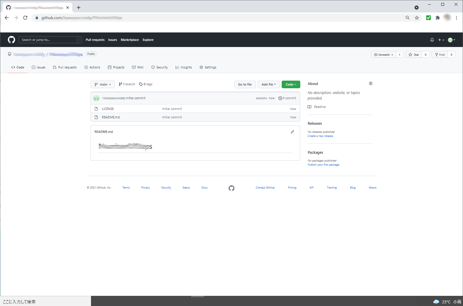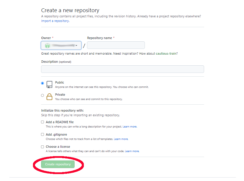 リポジトリ名(他と被らない)、公開/非公開を決めて「create repository」ボタンをクリックします。※ReadMEや.gitignoreは後からでも登録できるので、必要があればライセンスだけ選択