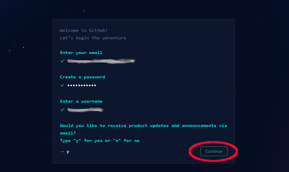 アップデート情報をメールで受け取るか聞いてくるので、受け取るのであれば「y」を入れて「Continue」をクリックします。