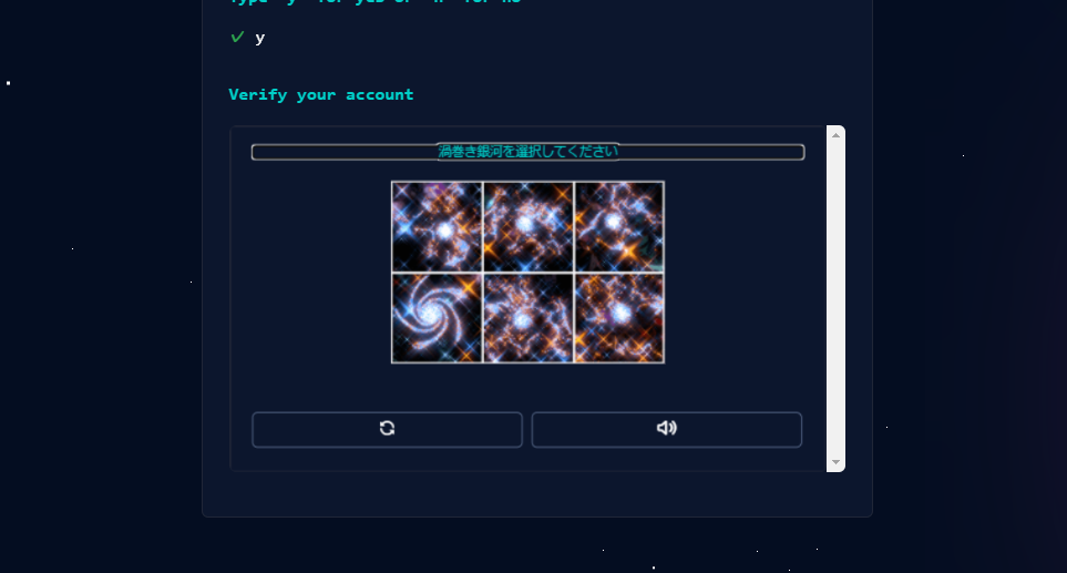 すると渦巻銀河を選択する画面が表示される。選択が完了すると「Create account」ボタンが表示されるのでクリックします。なお選択画面は定期的に変更されるようです。