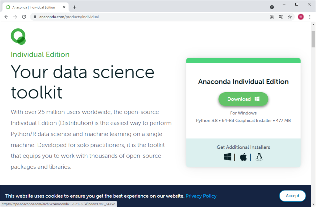 まず初めにAnacondaのインストーラを公式サイトからダウンロードします。
