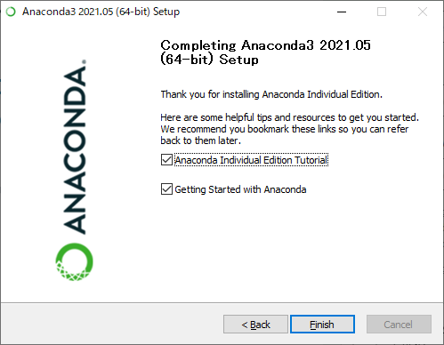 ※チェックがついているとチュートリアルやanacondaクラウドの案内ページが表示されるのでウザければチェックを外してください