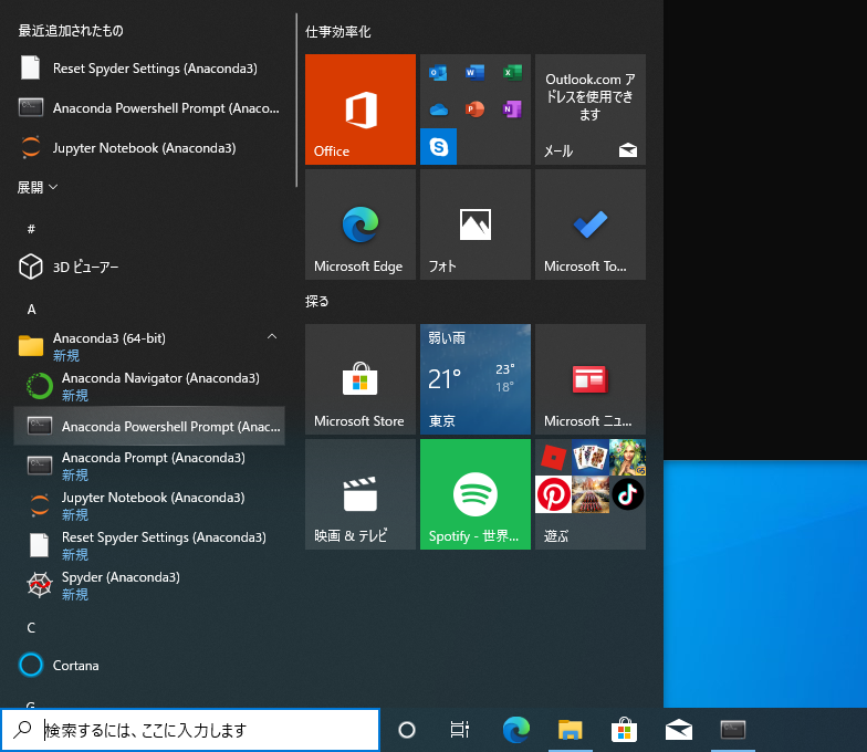 インストールが完了したらスタートボタンからAnaconda Powershell Prompt(Anaconda3)を起動してください。