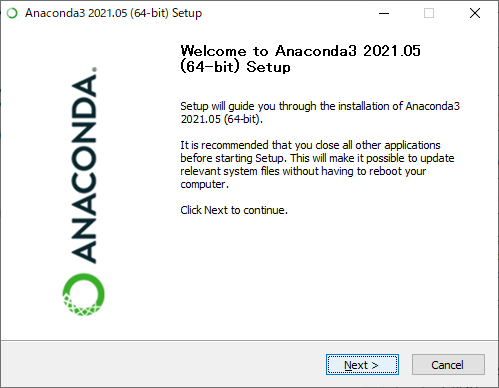 インストーラが立ち上がるので、「Next >」ボタンをクリックして次画面に進みます。